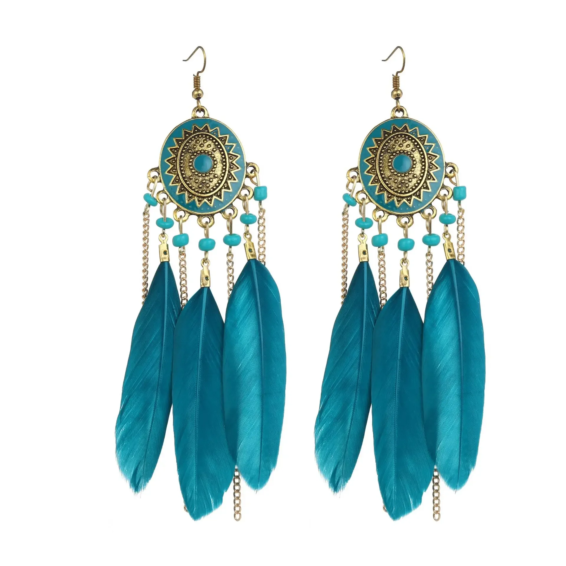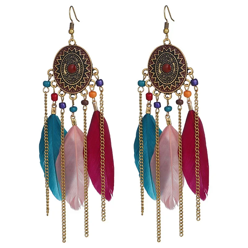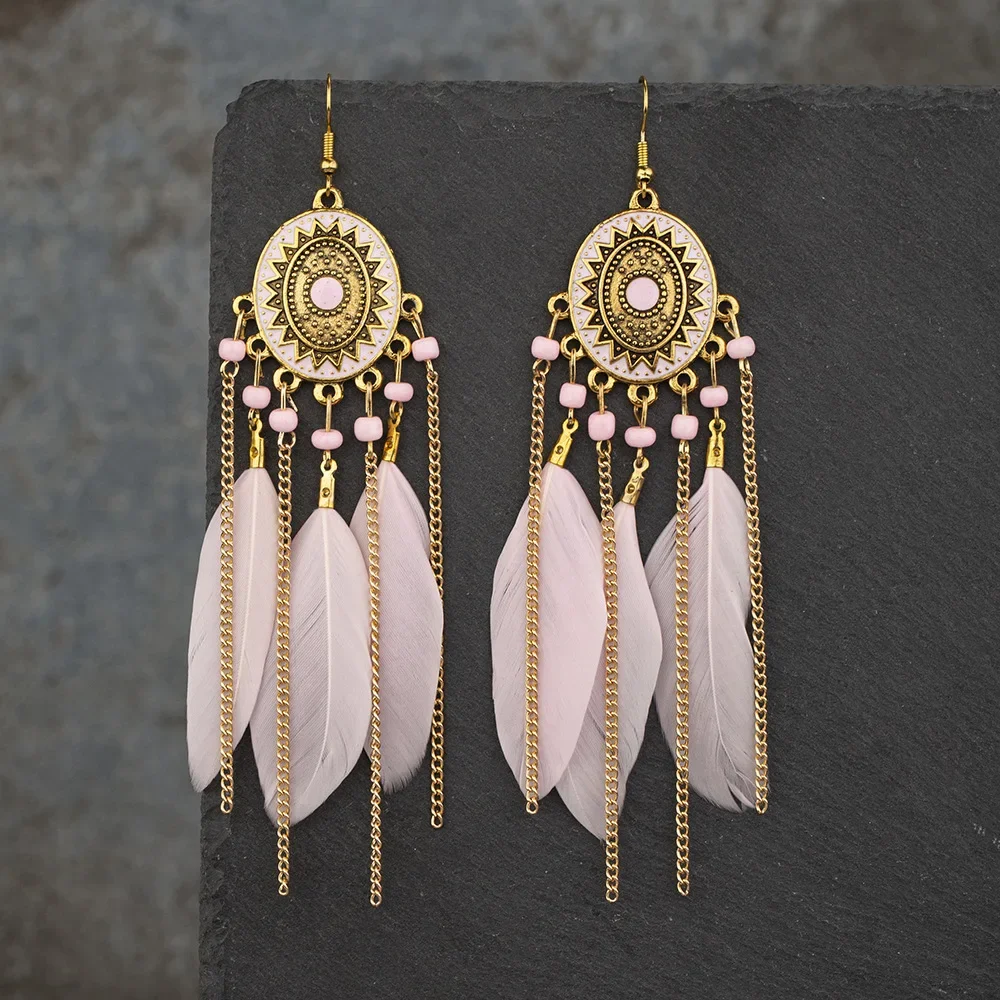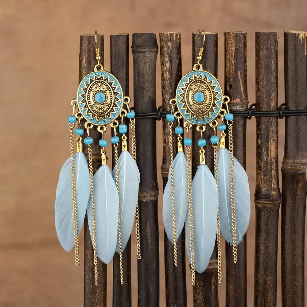 Ethnic Colorful Feather Tassel Earrings For Women Long Chain Beads Drop Dangling Earrings Girls Vintage Jewelry Accessories
