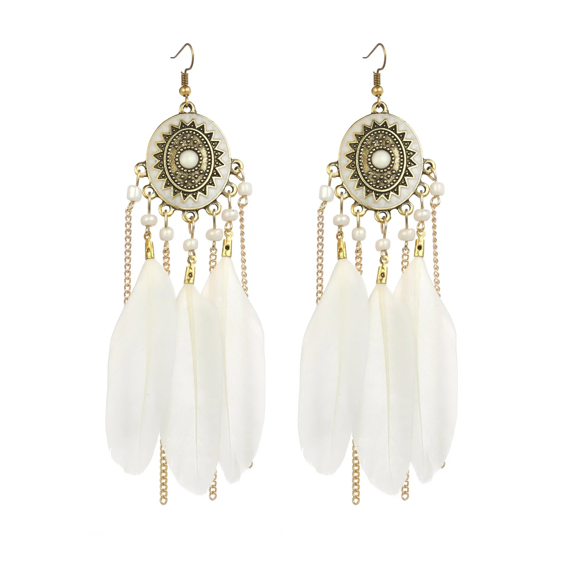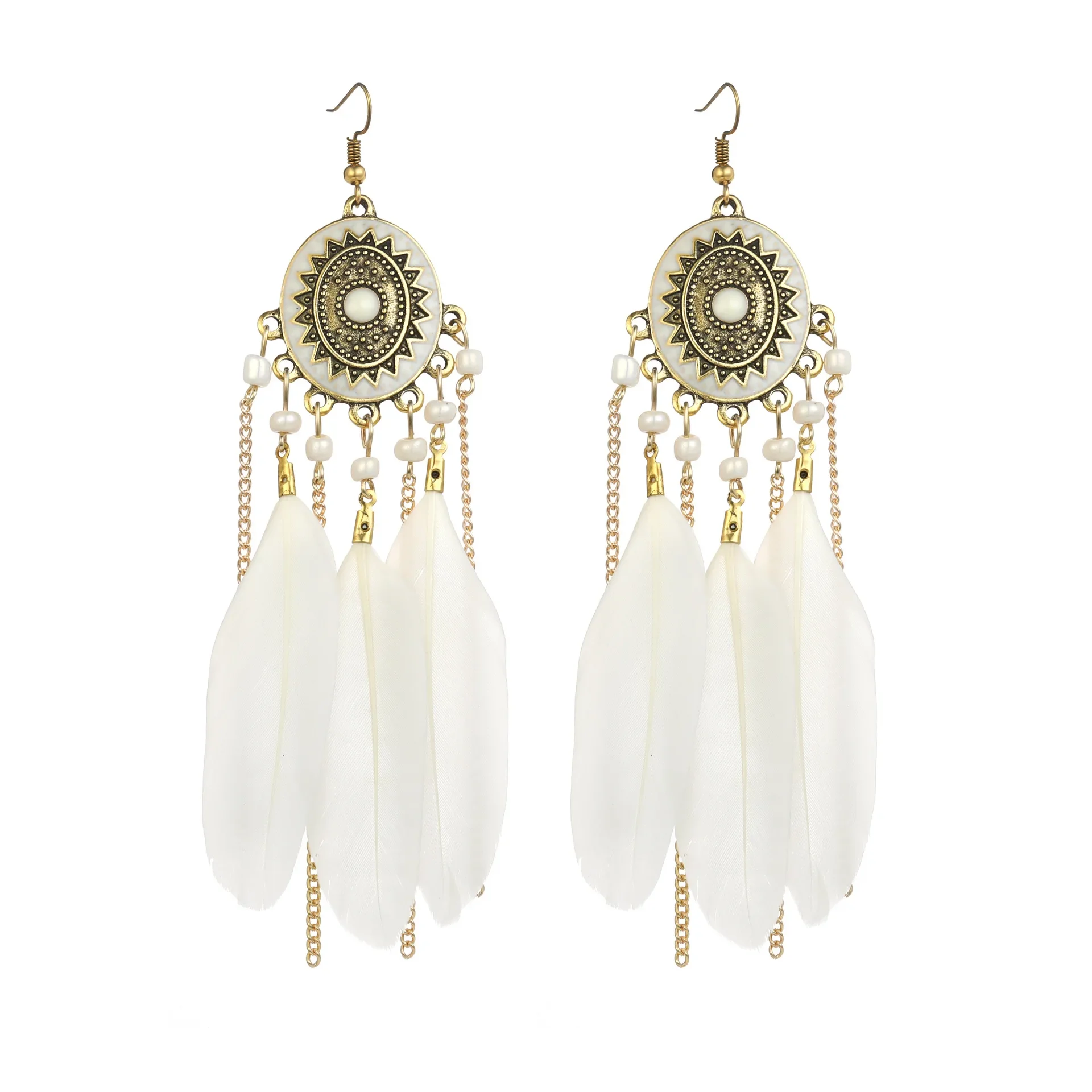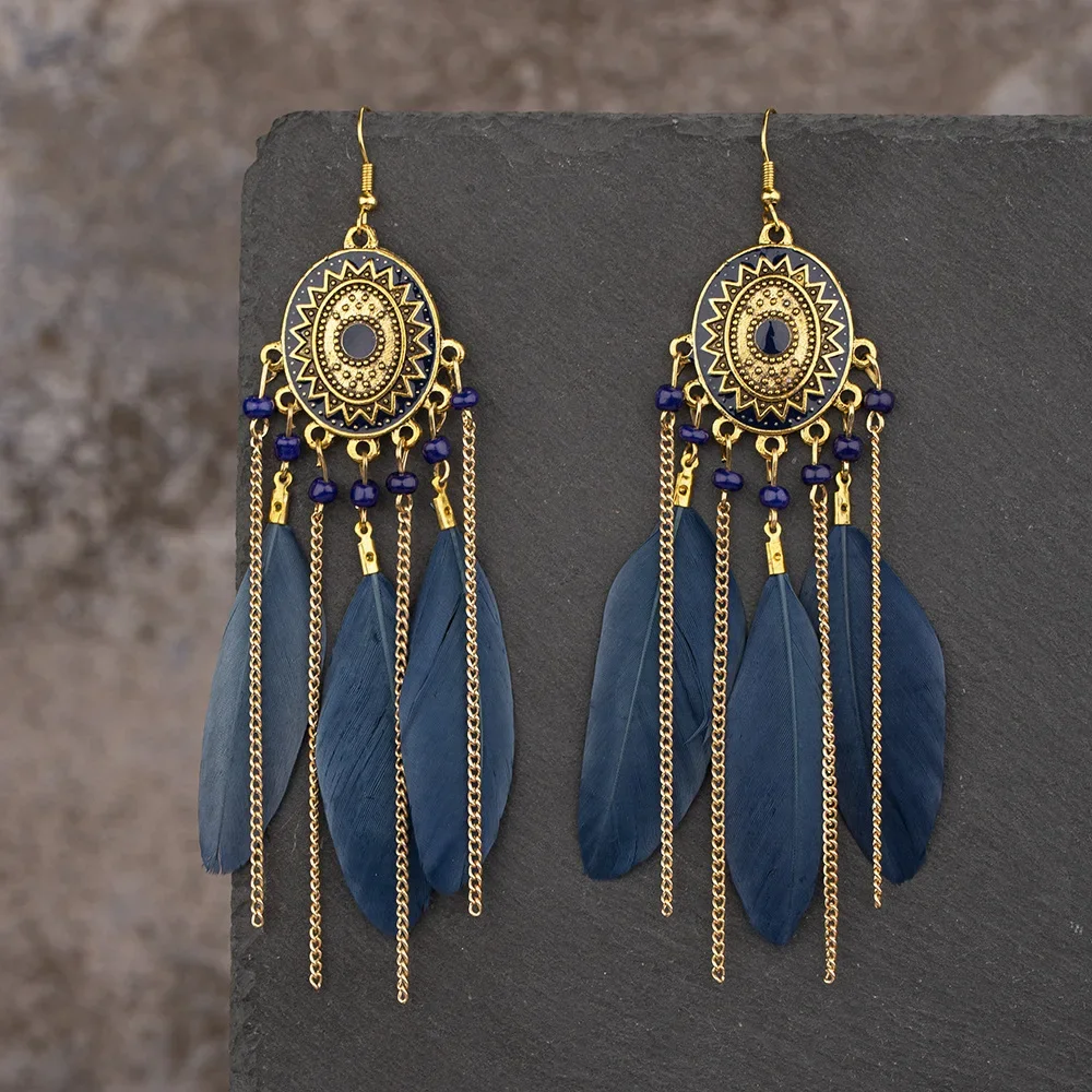 Ethnic Colorful Feather Tassel Earrings For Women Long Chain Beads Drop Dangling Earrings Girls Vintage Jewelry Accessories